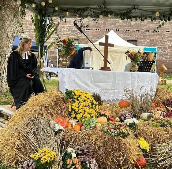 Der Erntedanksonntag begann mit einem Gottesdienst in freier Natur, den Pastorin Madeleine Landré mit vielen Besuchern gemeinsam feiern konnte.