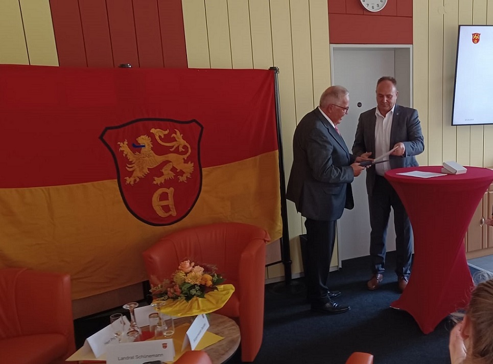 Aber seine große „Liebe“ gehört dem Schießsport und dem Schützenverein Bodenwerder (seit 1980), und auch hier hat Holger Pramann vielfältige Aufgaben/Ämter übernommen bis hin zur Führung des Vereins von 2003 bis 2013. In diese Zeit viel auch der Brand im Schützenheim und es gelang innerhalb eines Dreiviertel Jahres der Wiederaufbau. Mit dieser grandiosen Leistung hat sich Holger Pramann in den Herzen seiner Schießsportfreunde in Bodenwerder für immer verewigt. „Menschen wie Sie, verehrter Herr Pramann, prägen mit Ihrem ehrenamtlichen Engagement ganz wesentlich unser Miteinander. Sie sind damit Vorbild, Helfer und Respektperson zugleich“, so die abschließenden Worte des Herrn Landrats, der sich auch ganz persönlich herzlich bedankte und auch Frau Pramann mit einbezog, kurz vor dem Verlesen der Urkunde und dem Aushändigen des Bundesverdienstkreuzes.