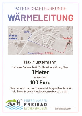 Der Freibadverein Eschershausen macht auf sich mit einer großen Spendenaktion aufmerksam. Um die Wärmeleitung zu finanzieren, welche von der Biogasanlage zum Freibad gelegt werden soll, damit das Wasser beheizt werden kann, kann eine Patenschaft pro Meter der Leitung erworben werden.