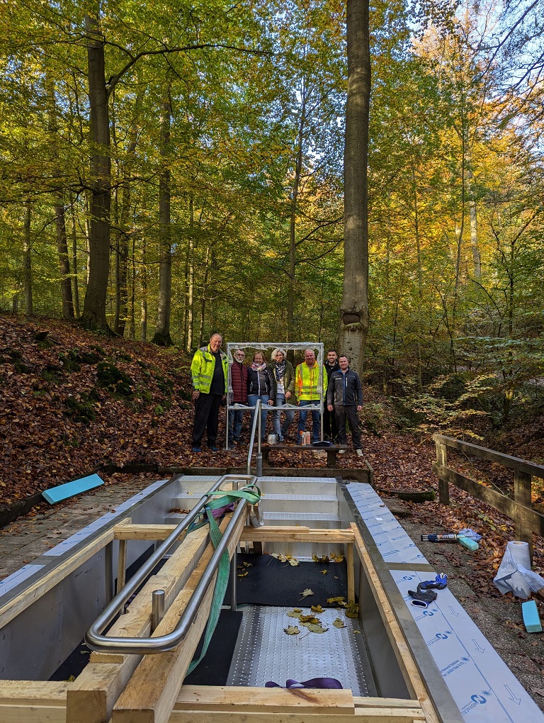 Im Rahmen der Leader-Förderung ist die Erneuerung des maroden Wassertretbeckens ein wesentlicher Punkt der Baumaßnahmen. Die Firma Schmidt-Edelstahl GmbH aus Hückeswagen hatte das Becken vermessen, die Edelstahlschale entworfen, auf Maß gearbeitet und schließlich auch eingesetzt. Von der Qualitätsarbeit konnten sich vor Ort Christine Bossow vom Landkreis Holzminden und Projektleiterin Carola Bartsch von der Verwaltung überzeugen. Ebenfalls anwesend war auch Ehrenpreisträger der Stadt Eschershausen Dieter Cebulla. Cebulla hatte jahrelang das alte Wassertretbecken gehegt und gepflegt und freute sich über diese großartige Investition der Stadt für das Wohlergehen der Bürgerinnen und Bürger. Leider nicht dabei sein konnte Stadtquartierspfleger Hans-Jürgen Heinzel, der das Projekt maßgeblich mit verantwortet hat. Er kümmert sich bereits seit einiger Zeit um die Wassertretbecken im Stadtgebiet.